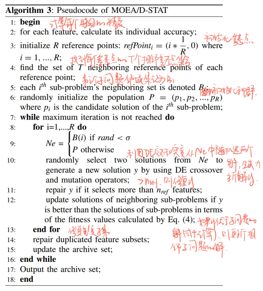 算法3显示了用于特征选择的静态多参考点MOEA/D(MOEA/D-stat)的伪代码。