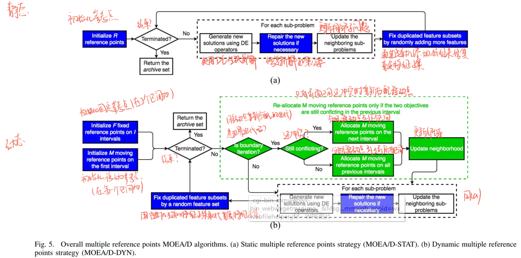 图5中,蓝色的部分是本算法与标准MOEA/D算法的主要不同之处 ,图5(b)中的绿色标记是动态和静态机制的区别,即移动参考点的重新分配。只有当算法尚未识别出阈值区间时才会执行重新分配。一旦找到阈值区间,M个移动参考点将被分配给冲突的间隔,并且不需要进一步的重新分配。这两种算法都使用了相同的差分进化(DE)交叉和突变算子,这是保持种群多样性的有效方法。