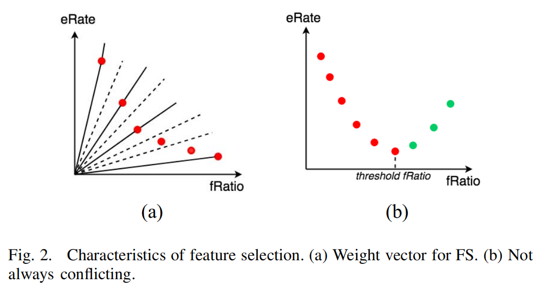 如果使用权值向量来分解特征选择,则必须仔细选择这些向量;否则,就会出现不对应于帕累托正面的任何解的向量,如图2(a)中的虚线所示