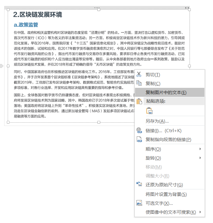 2. 将以上图片复制到OneNote,点击右键,点击“复制图片中的文本”