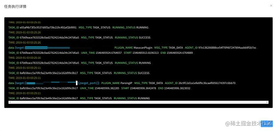 性能提升 : Python的性能确实比较低,但大多是计算密集型的场景会产生瓶颈,像安全扫描这种IO密集型的还是不会产生太大的影响,在前文已经介绍过分片的原理,这里我们拿具体数据来测试一下,切片+分布式的性能提升状况。我们拿端口扫描为例,10000+个IP ,进行全端口+服务指纹扫描,如图所示,节点{1,3,6,9}分别耗时{25220.28, 5386.728 , 3076.681 ,1624.101} (秒), 优化到之前时间消耗的6.4%。