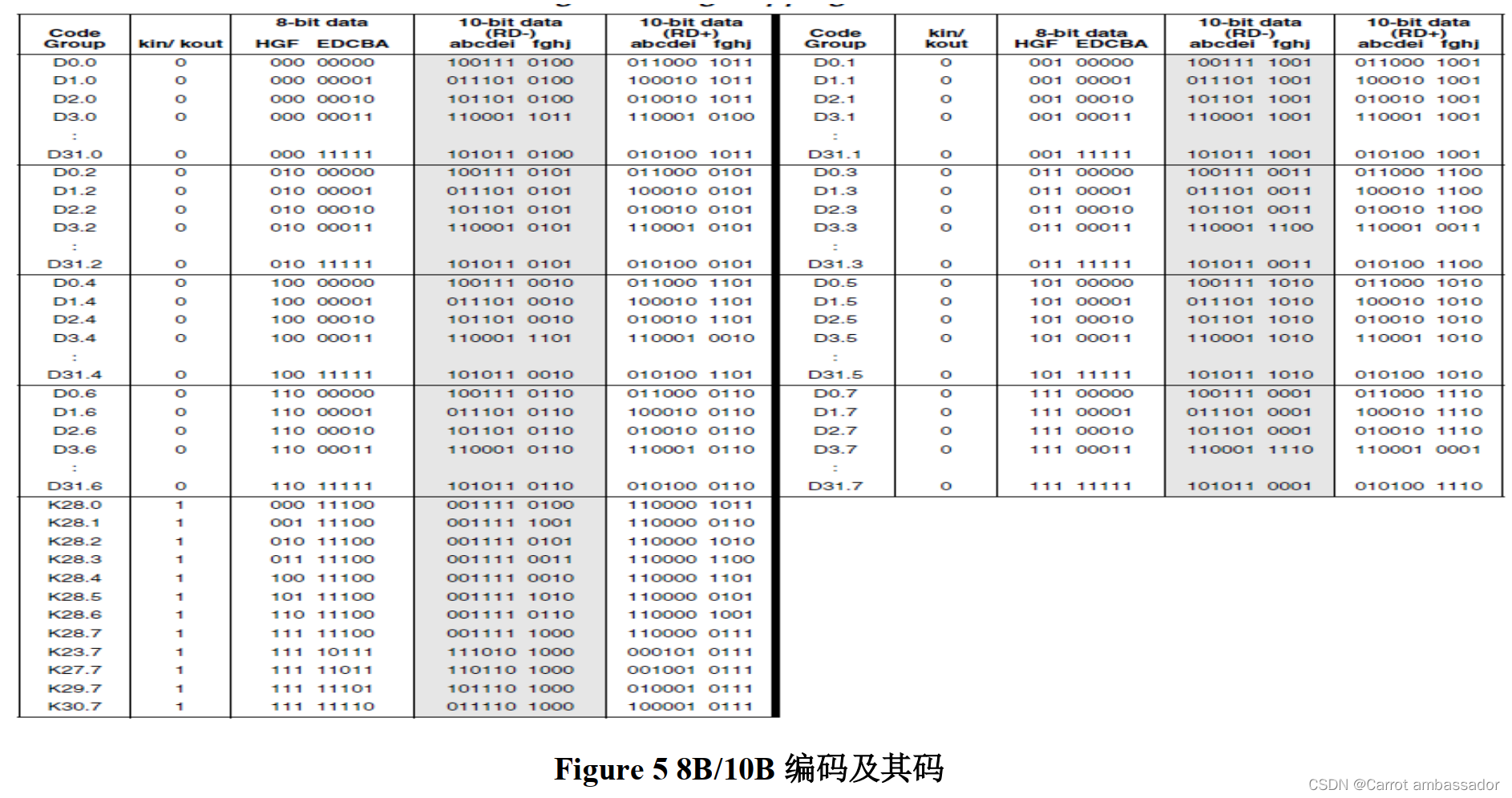 8B/10B 编码的状态机和码表如下图所示。 编码的目的就是去除数数据中的 DC-unbalance(CML电平中会增加直流偏置),8bit变为 10bit。 例如我们通常所说的 K28.5,8 bit 的时候为 BC,编码后变成 00……。