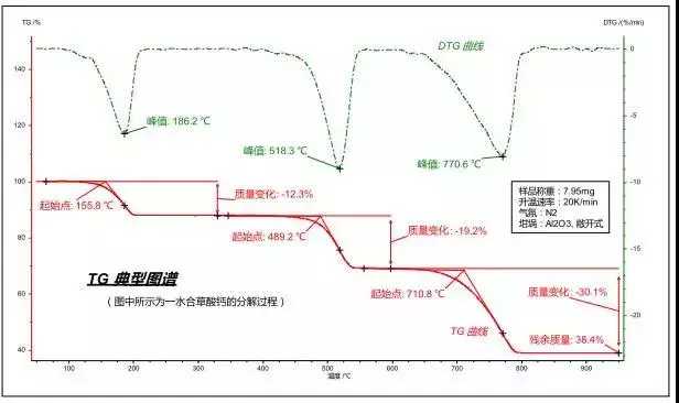 当样品发生重量变化(其原因包括分解、氧化、还原、吸附与解吸附等)时,会在TG曲线上体现为失重(或增重)台阶,由此可以得知该失/增重过程所发生的温度区域,并定量计算失/增重比例。若对TG曲线进行一次微分计算,得到热重微分曲线(DTG曲线),可以进一步得到重量变化速率等更多信息。