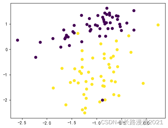 讯享网from sklearn import datasets import matplotlib.pyplot as plt data,target = datasets.make_classification(n_samples=100,n_features=2, n_informative=2,n_redundant=0,n_repeated=0, n_classes=2,n_clusters_per_class=1) print(data.shape) # (100, 2) print(target.shape) # (100,) plt.scatter(data[:,0],data[:,1],c=target) plt.show()