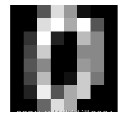 from sklearn.datasets import load_digits X, y = load_digits(return_X_y=True) plt.imshow(X[0].reshape(8, 8), cmap='gray');# 下面完成灰度图的绘制 # 灰度显示图像 plt.axis('off')# 关闭坐标轴 print('The digit in the image is {}'.format(y[0])) # 格式化打印 The digit in the image is 0