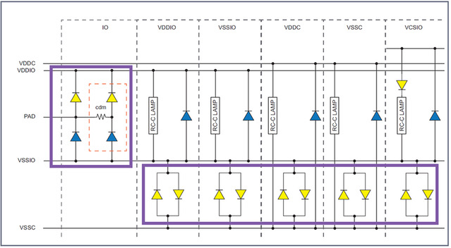 ·芯片核心区域的VDDC和VSSC焊盘之间的ESD保护(内部电源到核心)