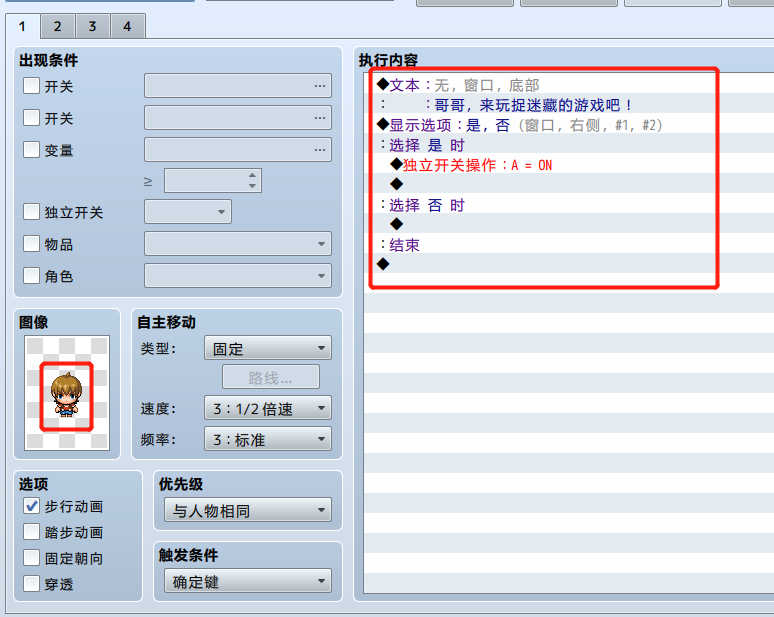 创建对话选项,如果主角接受则开启A开关(即执行事件2)
