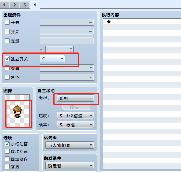 此时设置任务接近,当人物接近后则促发对话,然后开启C开关(执行事件4)
