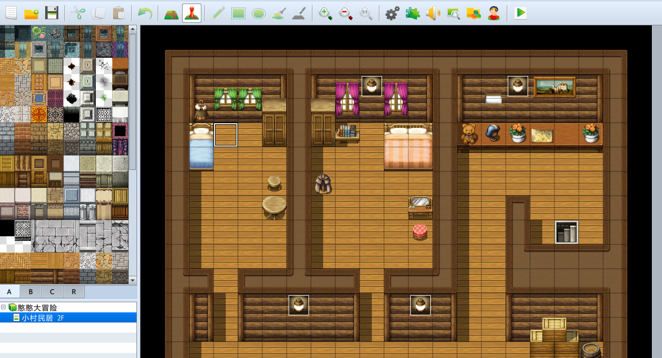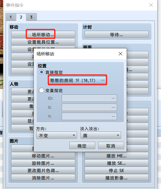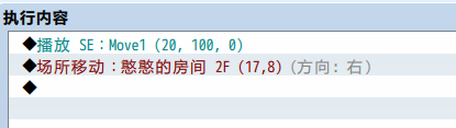 双击2F的楼梯会出现一个事件编辑器,然后双击黑色方格所在行,然后选择面板2,选择场所移动,指定移动位置和方向(方向是由画面楼梯的朝向决定的)