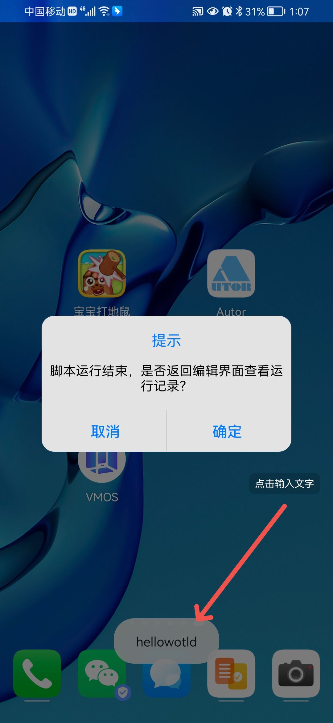- 我们看屏幕下部出现提示文字"helloworld"