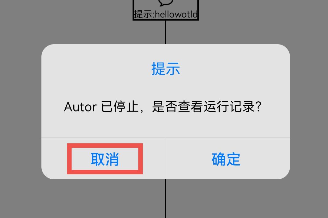 - 根据刚才流程图中节点和线的关系,这个提示永远不会结束,我们点击这个闪烁的(闪烁是为防止影响判断屏幕)、有Autor标志的悬浮、自转按钮,点击结束按钮结束这个脚本