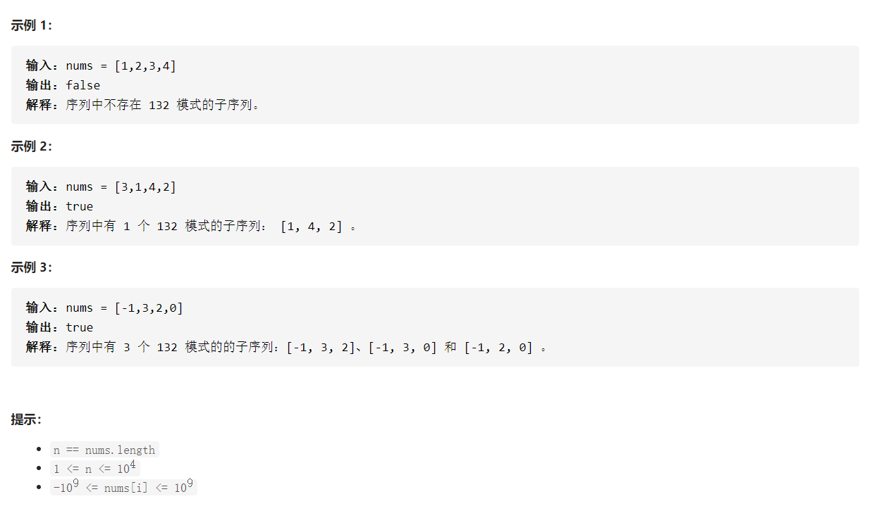 如果 nums 中存在 132 模式的子序列 ,返回 true ;否则,返回 false 。