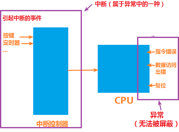 其中,在上面,狗叫猫叫,门铃声,小孩的哭声属于中断,而身体不舒服、电脑坏了,属于异常(没有办法屏蔽)