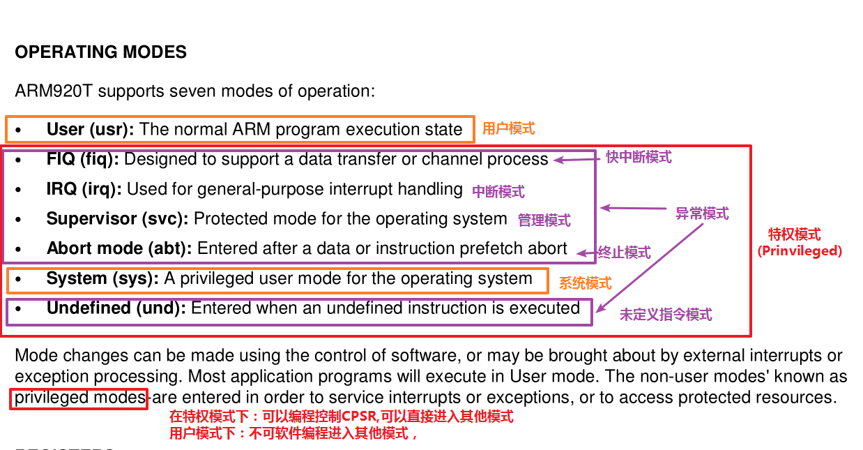 ARM的CPU共有七中模式,除了用户模式(系统模式),其他6种都是特权模式,处于特权模式可以通过修改CPSR寄存器切换到其他模式,但是处于用户模式,就不能修改CPSR寄存器进入其他模式。
