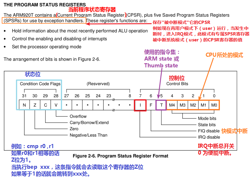 因为复位处于管理模式,是一种特权模式,所以可以通过改变cpsr寄存器的位,来切换到usr模式,各位的描述如下: