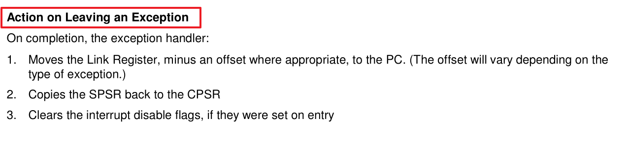 2.恢复CPSR的值,从SPSR寄存器。CPSR = SPSR_异常