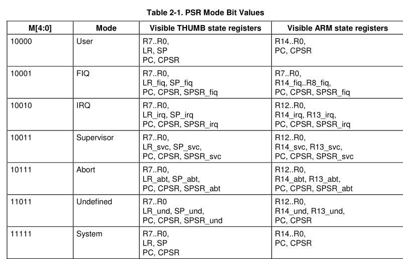 3.修改CPSR的模式位,进入异常模式(M4-M0),其位状态如下说明: