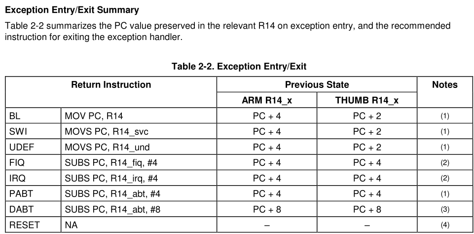 1.LR寄存器减去某个值,复制给PC(R15)=> PC = LR_异常 - offset,如下表