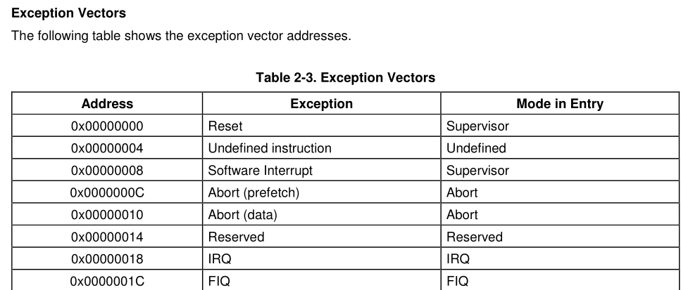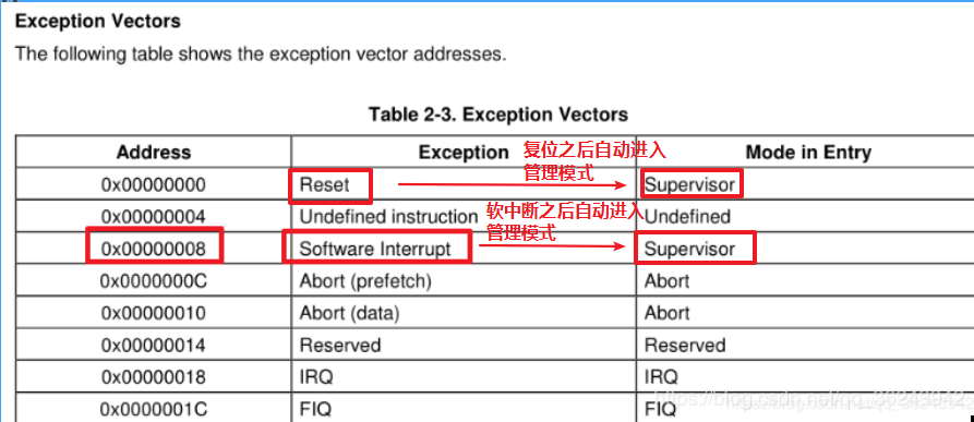 跳转到何处根据向量表决定,如下,不同异常跳到不同的地址: