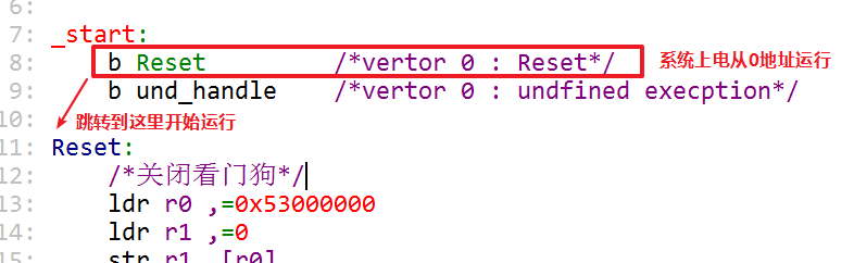 默认跳转到Reset,在0地址添加一个跳转指令:b Reset,然后定义一个入口Reset,系统一上电后复位,从0地址开始运行,0地址是一个跳转指令,跳转到Reset的地方。