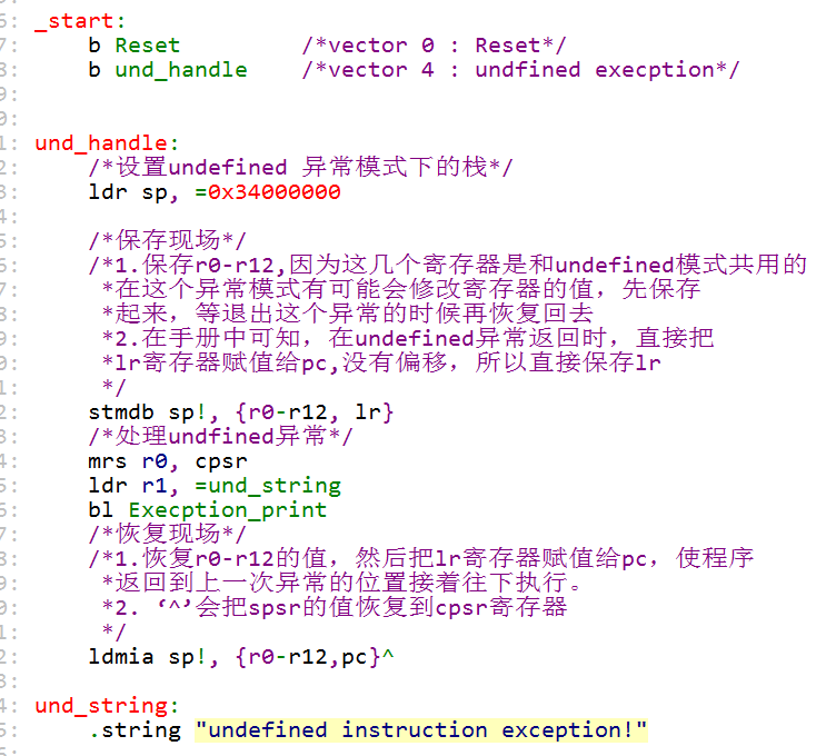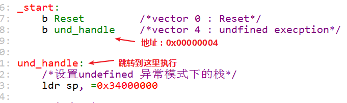 如果发生了未定义指令异常,CPU直接跳转到0x0000004的地方(这是硬件决定的),在0x04的地方放一条跳转指令,当发生未定义指令异常时,我们自己需要去处理这个异常。