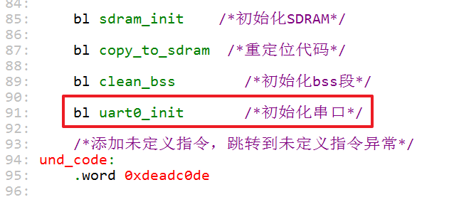 ②跳转到Reset向下继续执行,做了一系列初始化工作,比如设置系统模式的栈,设置系统时钟,初始化SDRAM,代码重定位,清除bss段,初始化串口等工作。