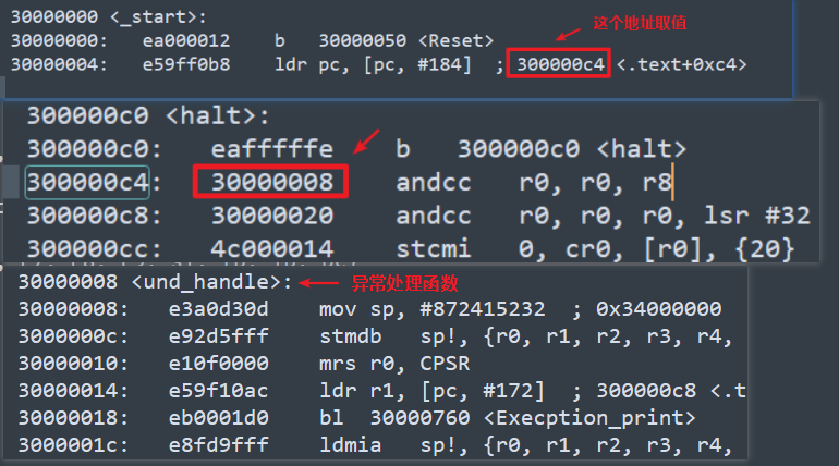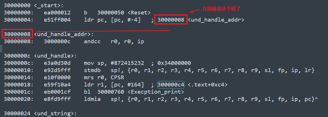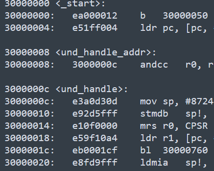 在执行到这条指令,CPU读取指令之后解析,发现没办法执行,就会发生未定义指令异常,硬件就会跳到:0x0000004的地方开始指令,而我们在0x4的地方放了一条跳转指令。接着就会开始执行:und_handle函数。