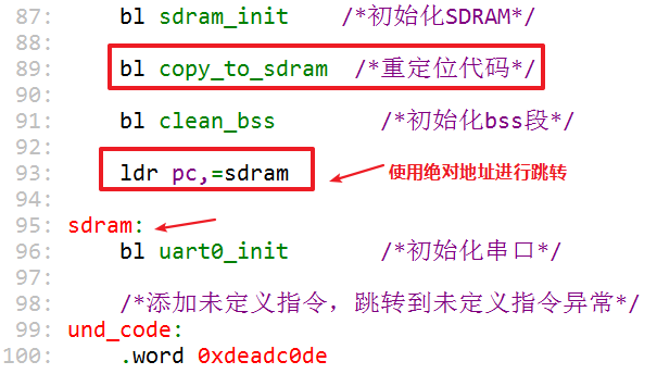 所以说在还没有进行重定位之前不可使用绝对跳转,因为还没重定位之前SDRAM是没有指令的,绝对跳转过去之后读取不到指令,系统就挂了。