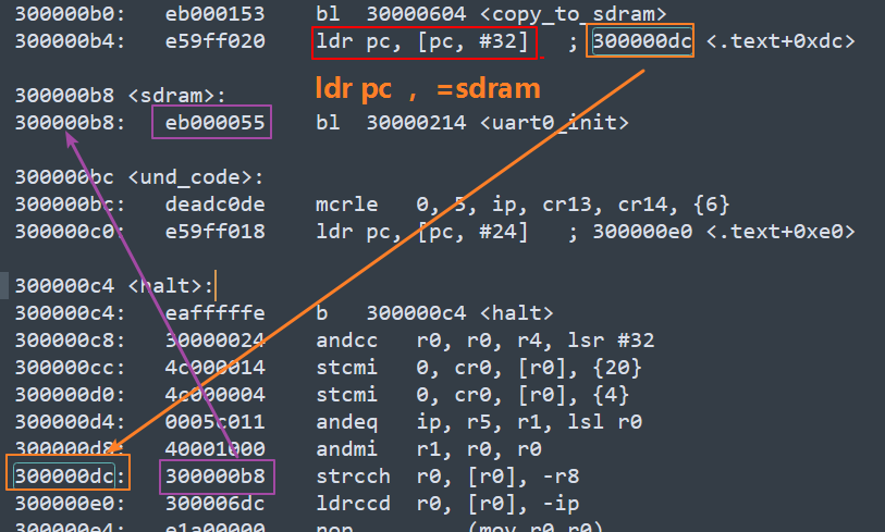 3).使用绝对跳转到SDRAM执行,ldr pc, = sdram,其中sdram是一个地址值。