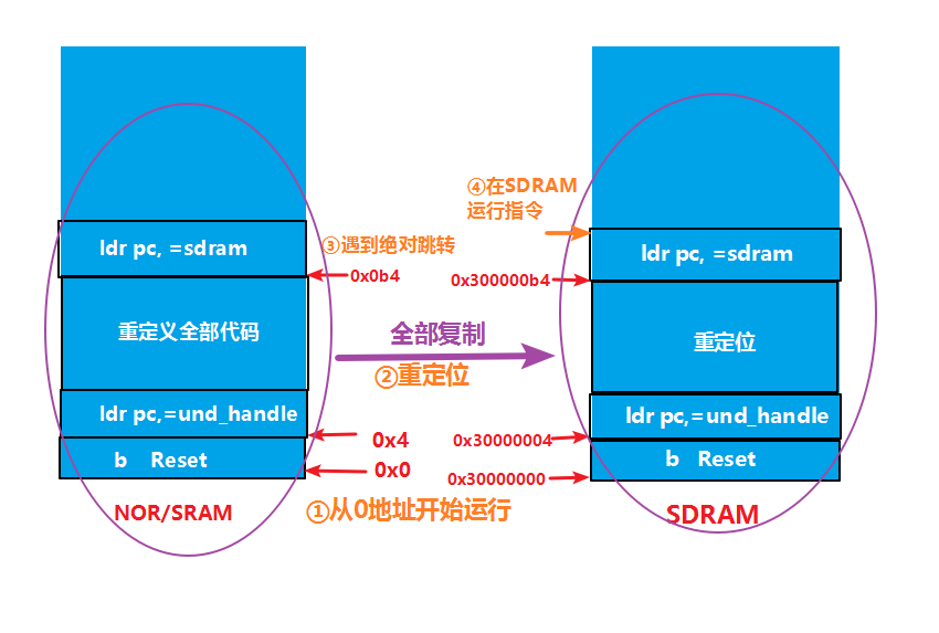 在NOR Flash运行,需要进行函数跳转的时候,使用的是相对跳转,bl或者b