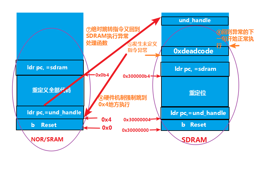 因为程序在执行错误的指令之前已经全部重定位到SDRAM了,所以在发生异常跳转的时候就不要使用相对地址了,使用绝对地址就行了。