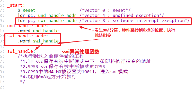swi_handle: /*执行到这之前硬件做的工作 *1.lr_svc保存有被中断模式中下一条即将执行指令的地址 *2.SPSR_svc保存有被中断模式的CPSR *3.CPSR中的M4-M0被设置为10011,进入svc模式 *4.跳到0x8地方开始执行 */ /*设置swi异常模式下的栈*/ ldr sp, =0x30d00000 /*保存现场*/ /*1.保存r0-r12,因为这几个寄存器是和swi异常处于管理模式共用的 *在这个异常模式有可能会修改寄存器的值,先保存 *起来,等退出这个异常的时候再恢复回去 *2.在手册中可知,在swi异常返回时,直接把 *lr寄存器赋值给pc,没有偏移,所以直接保存lr */ stmdb sp!, {r0-r12, lr} /*处理undfined异常*/ mrs r0, cpsr ldr r1, =swi_string bl Execption_print /*恢复现场*/ /*1.恢复r0-r12的值,然后把lr寄存器赋值给pc,使程序 *返回到上一次异常的位置接着往下执行。 *2. ‘^’会把spsr的值恢复到cpsr寄存器 */ ldmia sp!, {r0-r12,pc}^ swi_string: .string "SWI exception!" /*此处注意:因为上面的字符串有可能不是四字节的倍数 *所以此处需要加上一个四字节对齐,让Reset从四字节 *对齐的地方开始运行。 */ .align 4