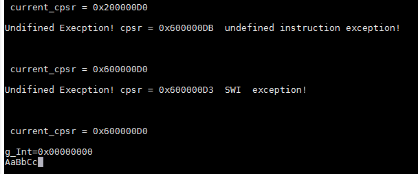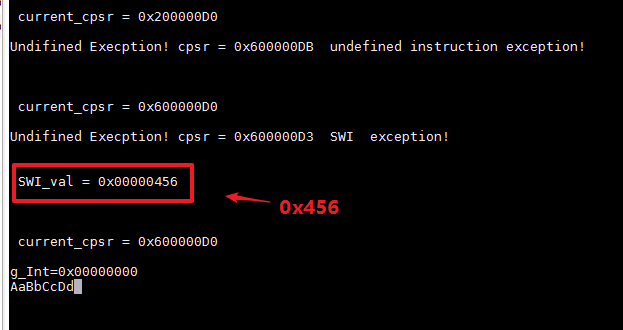 3).接着遇到指令:swi 0x456,产生swi异常,进入管理员模式(svc),cpsr = 0xD3,则[M4-M0] = 0b10011,接着进入swi异常处理函数,然后返回User模式继续运行接下来的函数,也就是跳转到主函数,打印出AaBbCc.....。