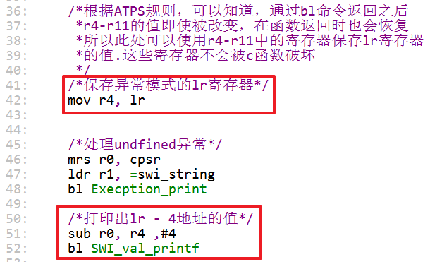 2.因为系统模式和Undefined模式公用了r0-r12寄存器,所以需要先备份这些寄存器,以便处理异常返回到系统模式继续执行正常的工作。此外还需要保存此模式下LR寄存器的值,因为如果下面执行到bl指令跳转,就会改变LR的值,就没有办法回到中断之前的位置了。