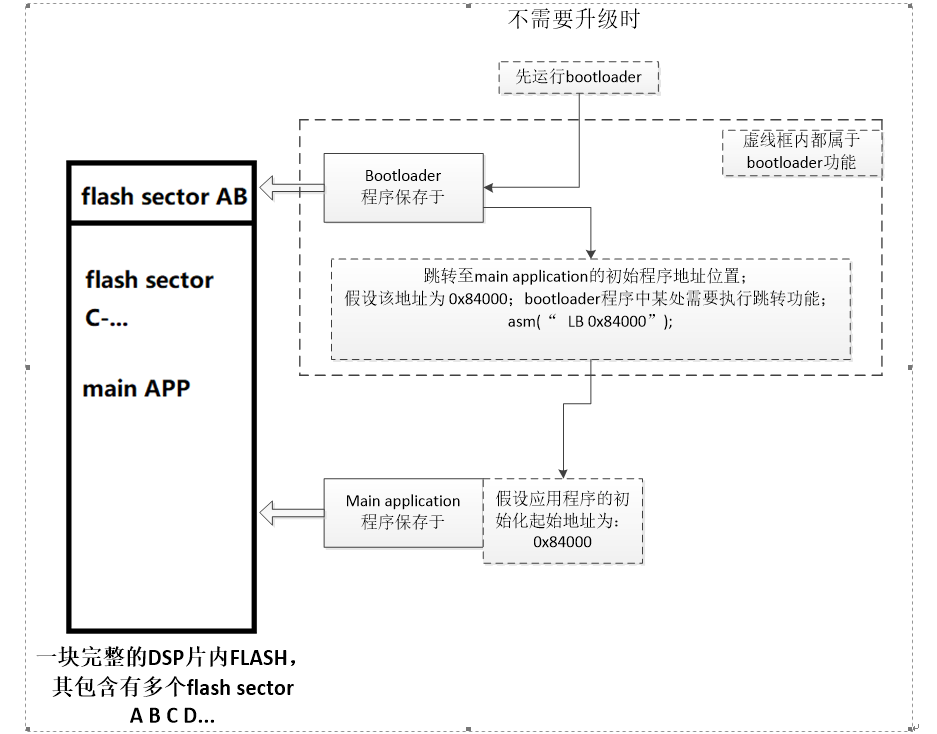 不需要在线升级时,系统上电直接先运行bootloader程序,由bootloader程序直接跳转至主应用程序 main application。