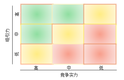 在使用麦肯锡矩阵的时候,一般是根据具体业务模块在市场上的竞争实力和所在市场的吸引力两个维度进行评估,每个维度用高中低三个档来评价,形成一个3×3的矩阵(九宫格):