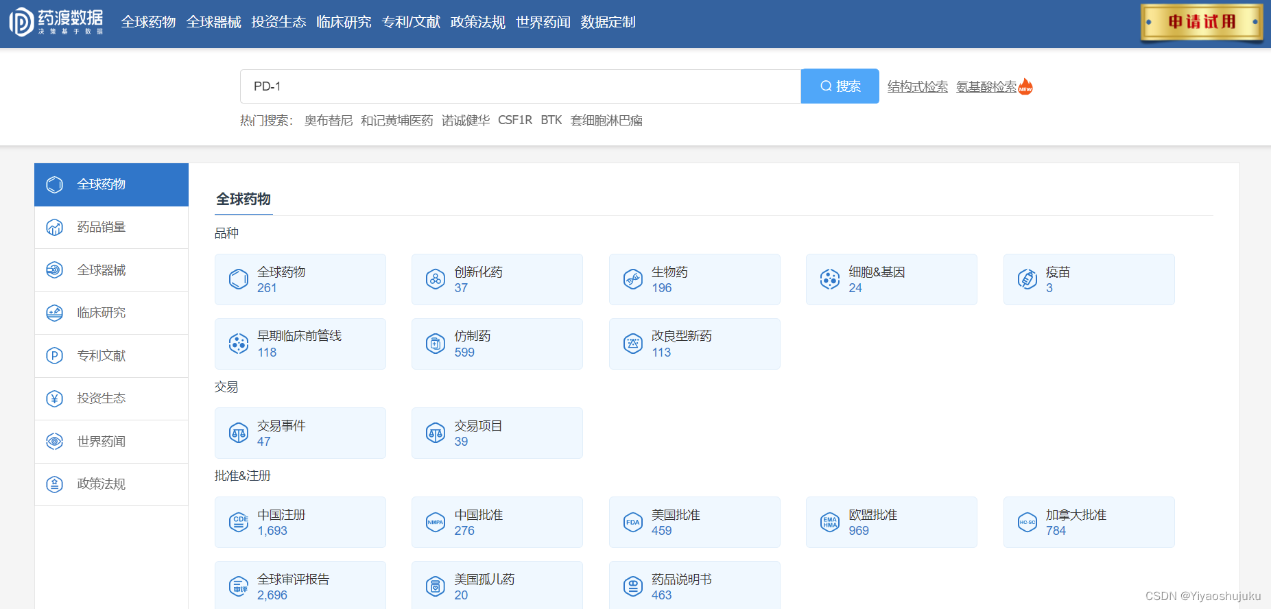 产品组成:由全球药物、全球器械、投资生态、临床研究、专利文献、政策法规、世界药问、数据定制八个版块构成。