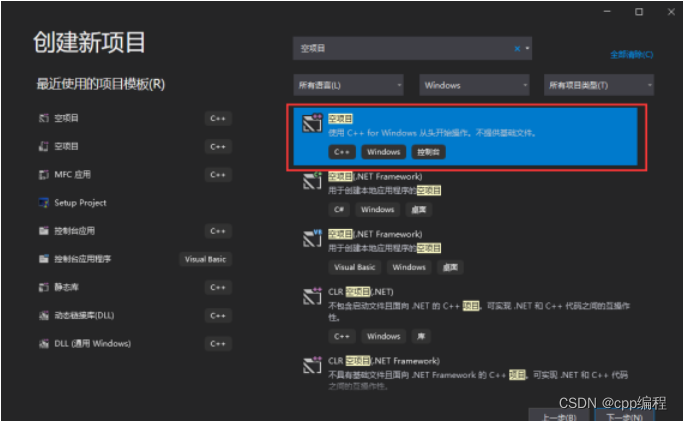 使用VS2019,或者其它版本的VS, 创建新项目,选择空项目模板。