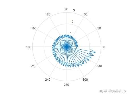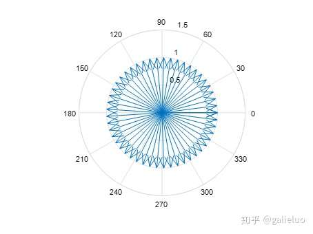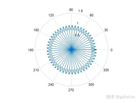 x=linspace(0,2*pi,50);%0到2pi之间均匀布置50个点; n=5000;%此处可将n设成20,50,500或其他 e_ix=(1+x*1i./n).^n; compass(e_ix);