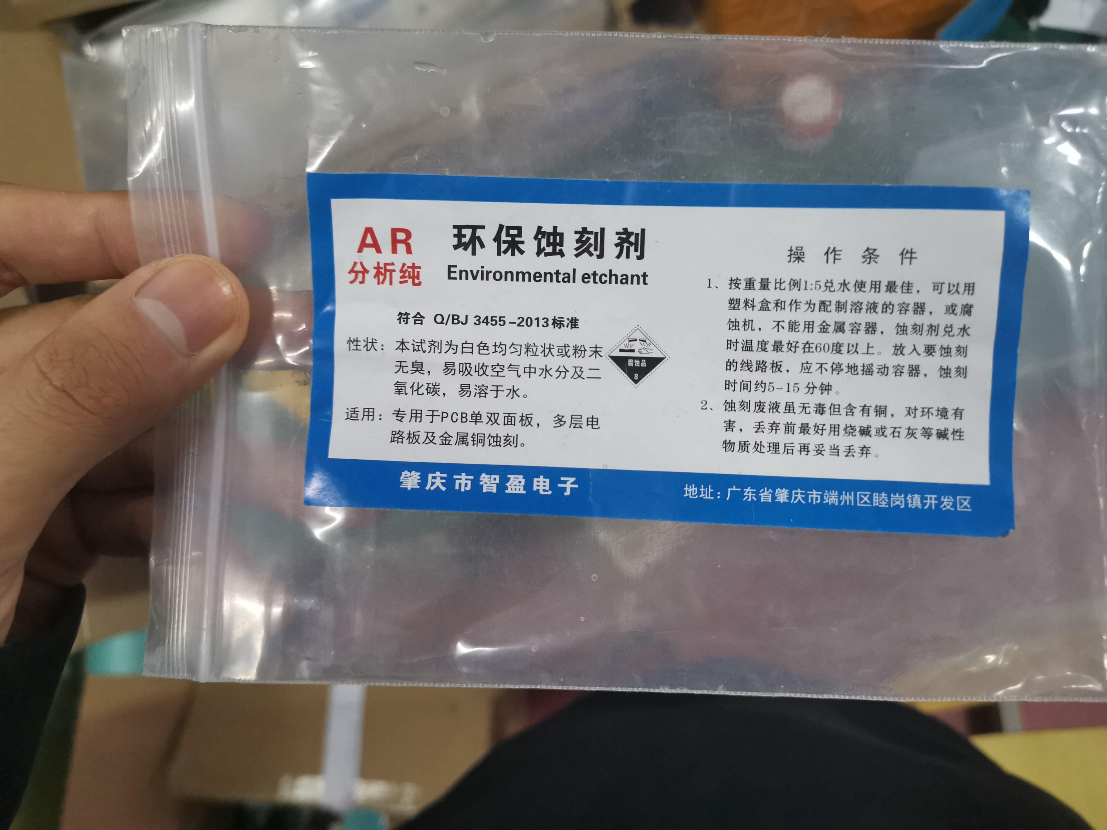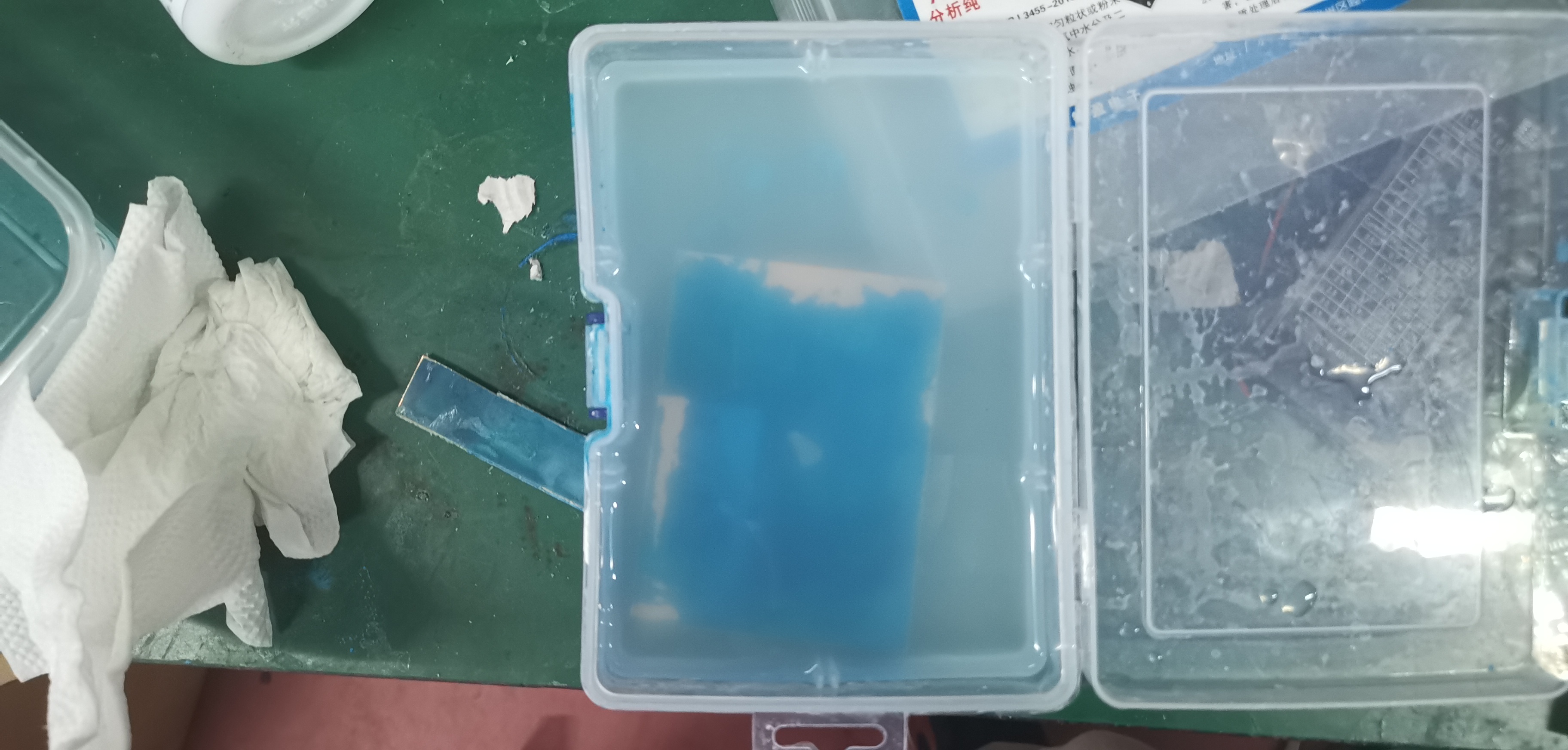 同样也是根据产品上的比例和温度配置好蚀刻溶液,将上一步的板子扔进蚀刻溶液中进行蚀刻