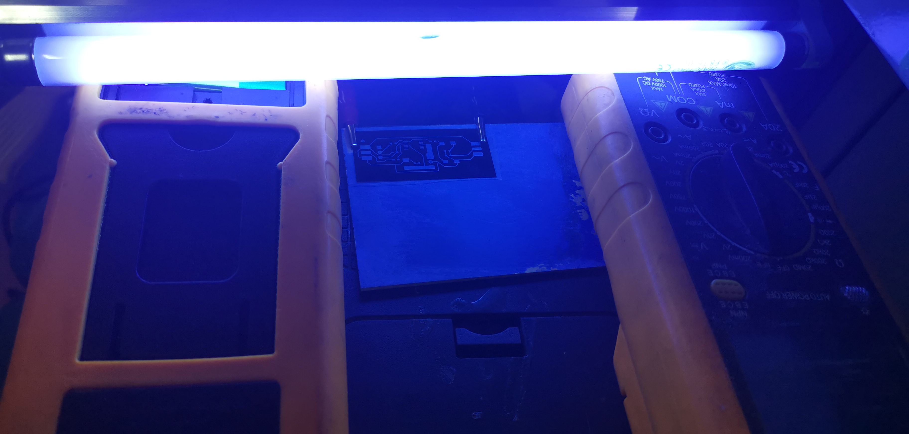 等到感光油墨干透后,将菲林纸紧贴覆铜板,然后用紫外线灯照射。切记时间不能过小(最起码要在五分钟),也不能过长,过长会导致显影失败。