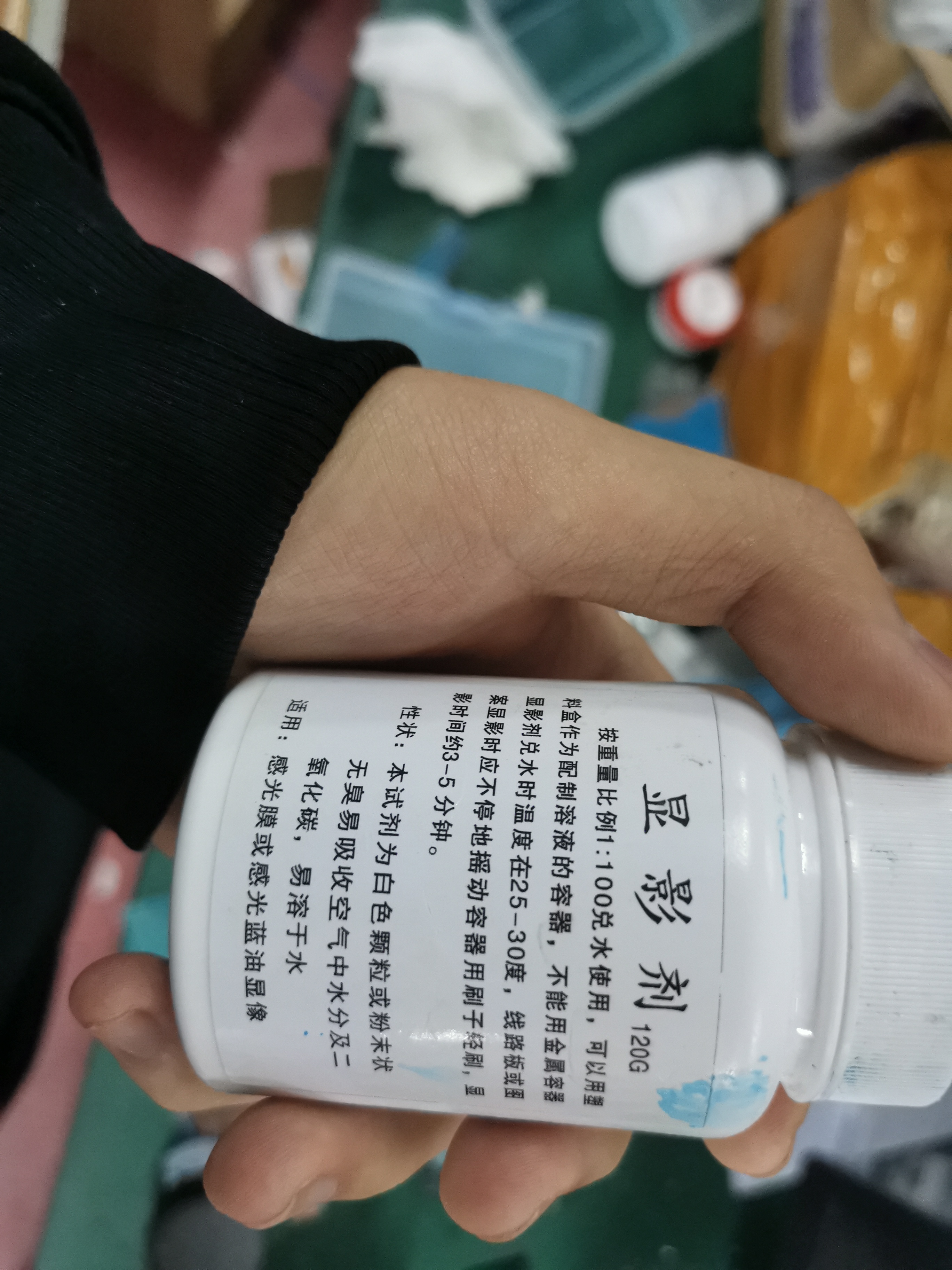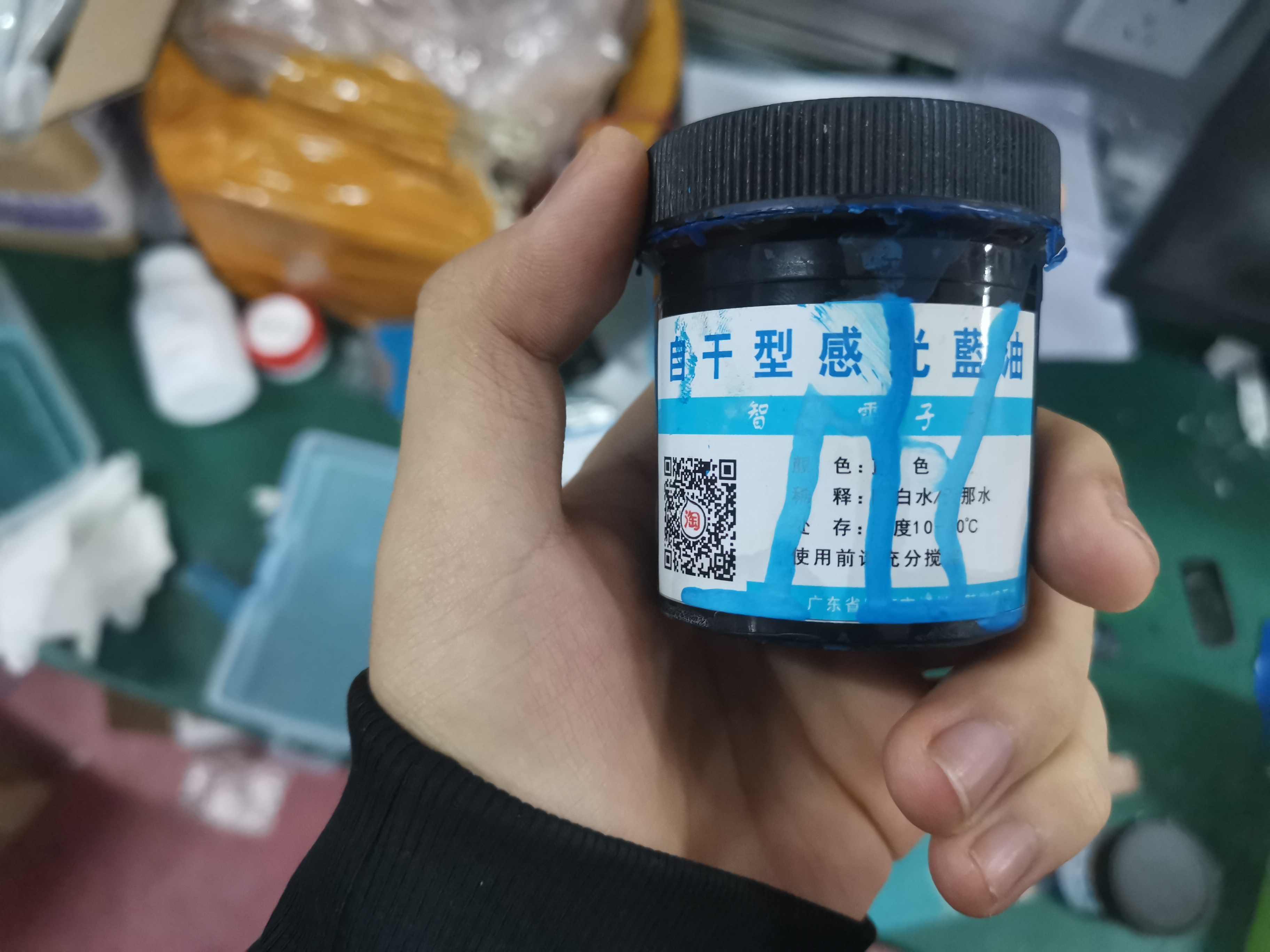 根据蓝油上的提示进行兑水搅拌,然后用毛刷或者滚筒均匀的涂在覆铜板表面