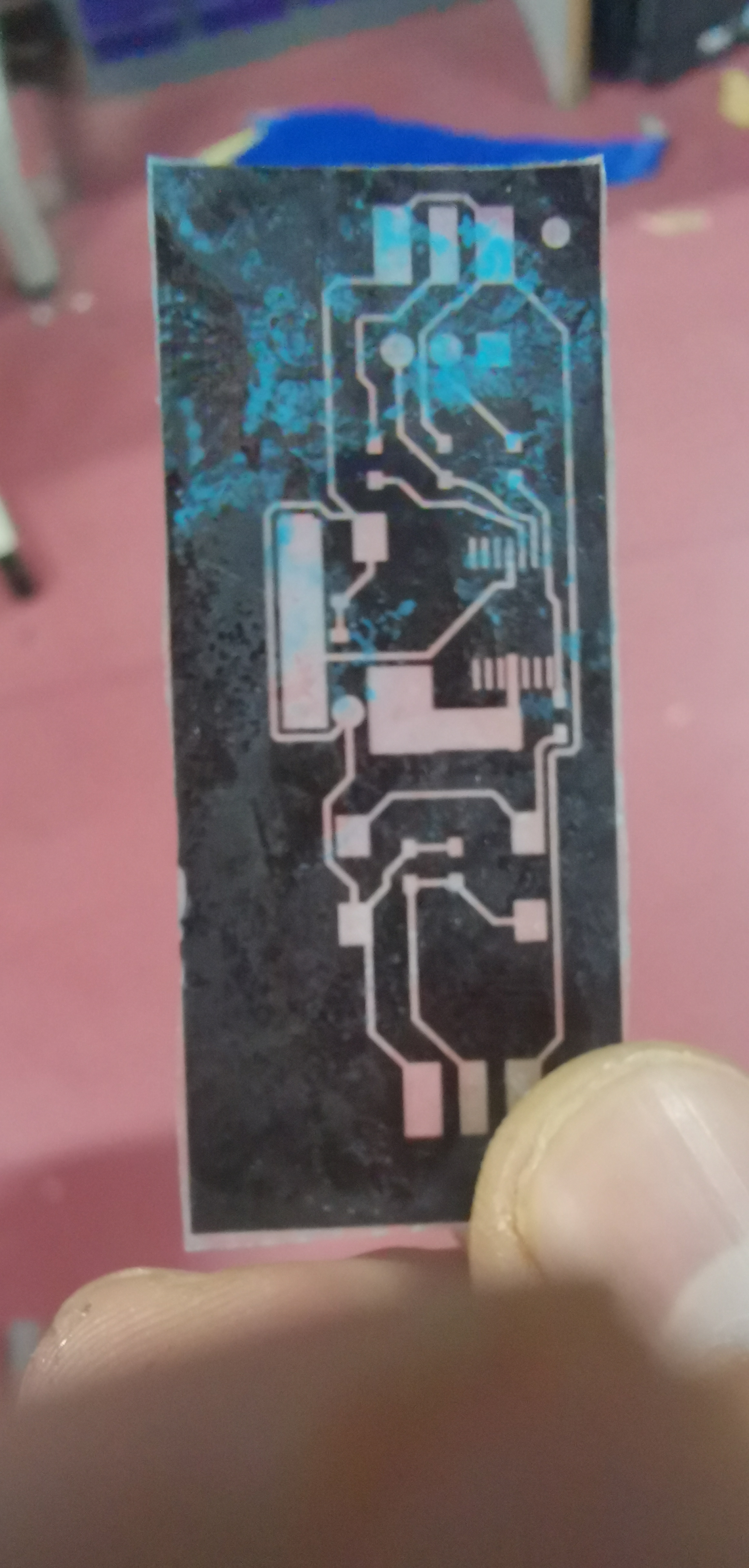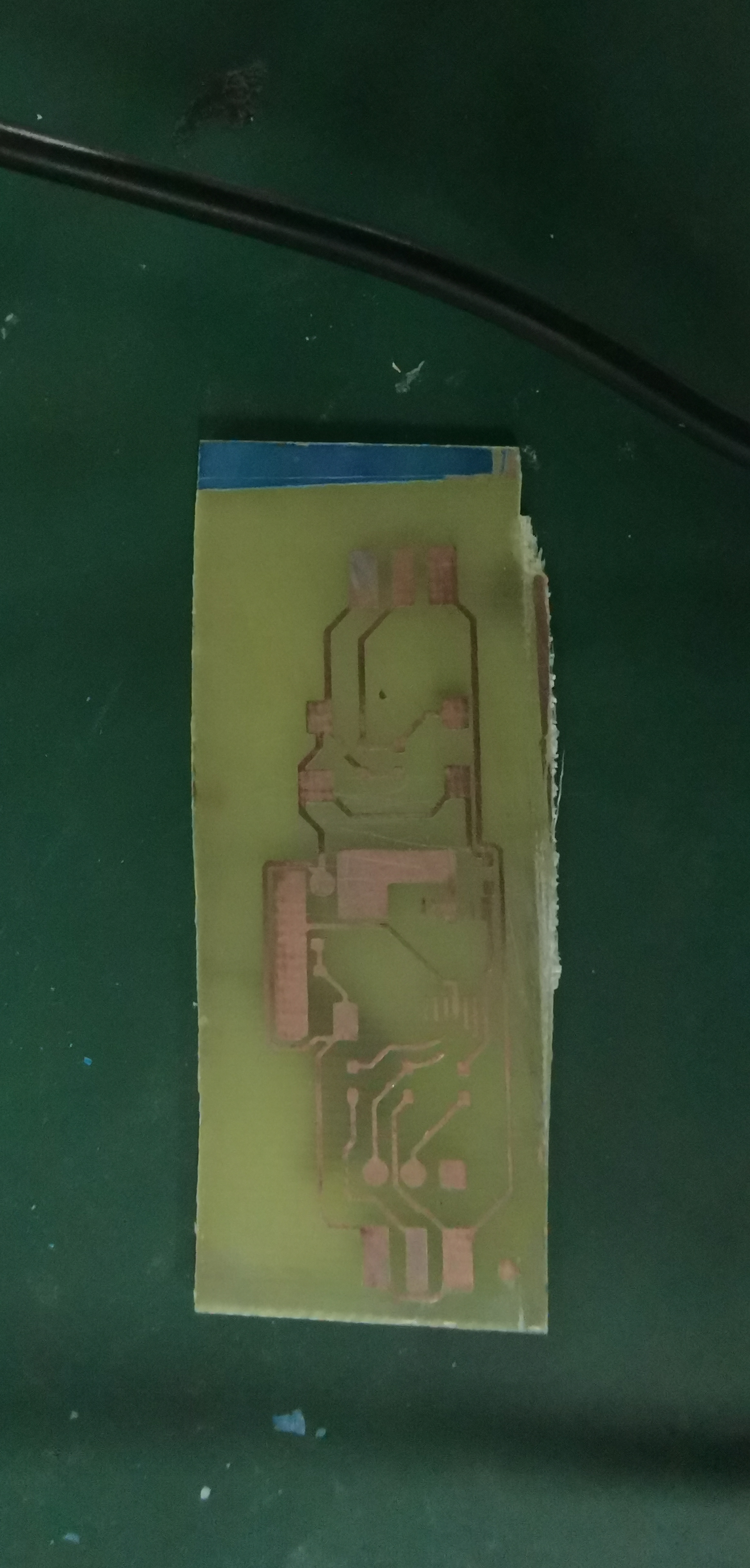 根据上面的比例和温度配置好显影液,就可以直接将上一步的覆铜板扔进去显影了