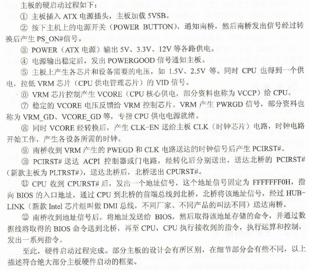 PS:以上为INTEL芯片组的上电流程,VIA和SIS的上电过程有些不一样,其中去掉了I/O的那一部分,即触发主板电源开关后,直接送出PWBTN#给南桥,南桥转出SUSB#(即SLP_S3#)信号给一个三极管的B极,这个三极管的C极接ATX电源的PSON引脚,E极接GND,SUSB#为高电平,此三极管的C、E极导到,将PSON#拉低,完成上电过程(有的主板采用的是MOS管,但其原理都是一样的,即在此处用SUSB#控制PSON的接地,以开关管的形式完成上电)