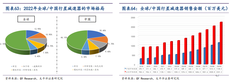 • 行星减速器的市场规模:行星减速器下游包括移动机器人,新能源设备,高端机床, 工程机械,电子设备等各类领域,应用场景较为分散。根据QY Research,2022年全 球行星减速器销量销售金额为12.0亿美元,其中中国境内销售金额为5.0亿美元。预 计2029年全球行星减速器销售规模达22.3亿美元,中国市场规模达11.5亿美元。