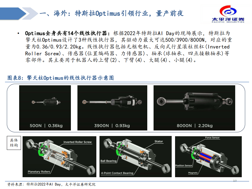 • Optimus全身共有14个线性执行器:根据2022年特斯拉AI Day的现场展示,特斯拉为 擎天柱Optimus设计了3种线性执行器,其驱动力最大可达500/3900/8000N,对应的重 量为0.36/0.93/2.20kg。线性执行器包括无框电机、反向式行星滚柱丝杠(Inverted Roller Screw)、传感器(位置编码器、力传感器)、轴承(球轴承、四点接触轴承)等 零部件。其主要用于机器人的上臂(2)、下臂(4)、大腿(4)、小腿(4)。