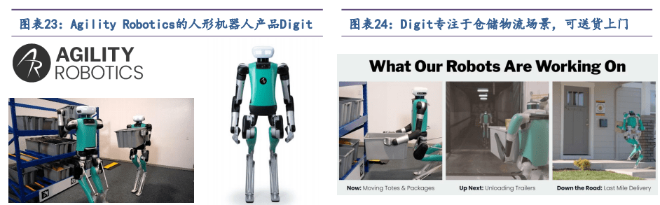 • 脱胎于校园,推出人形机器人Digit:Agility Robotics成立于2015年,是由俄勒冈 州立大学孵化出来的机器人公司。Agility最早推出的机器人为Cassie(仅有双足), 2019年在Cassie的基础上加上躯干和手臂,从而推出了人形机器人Digit,作为“机器人同事”安全、自主地工作。