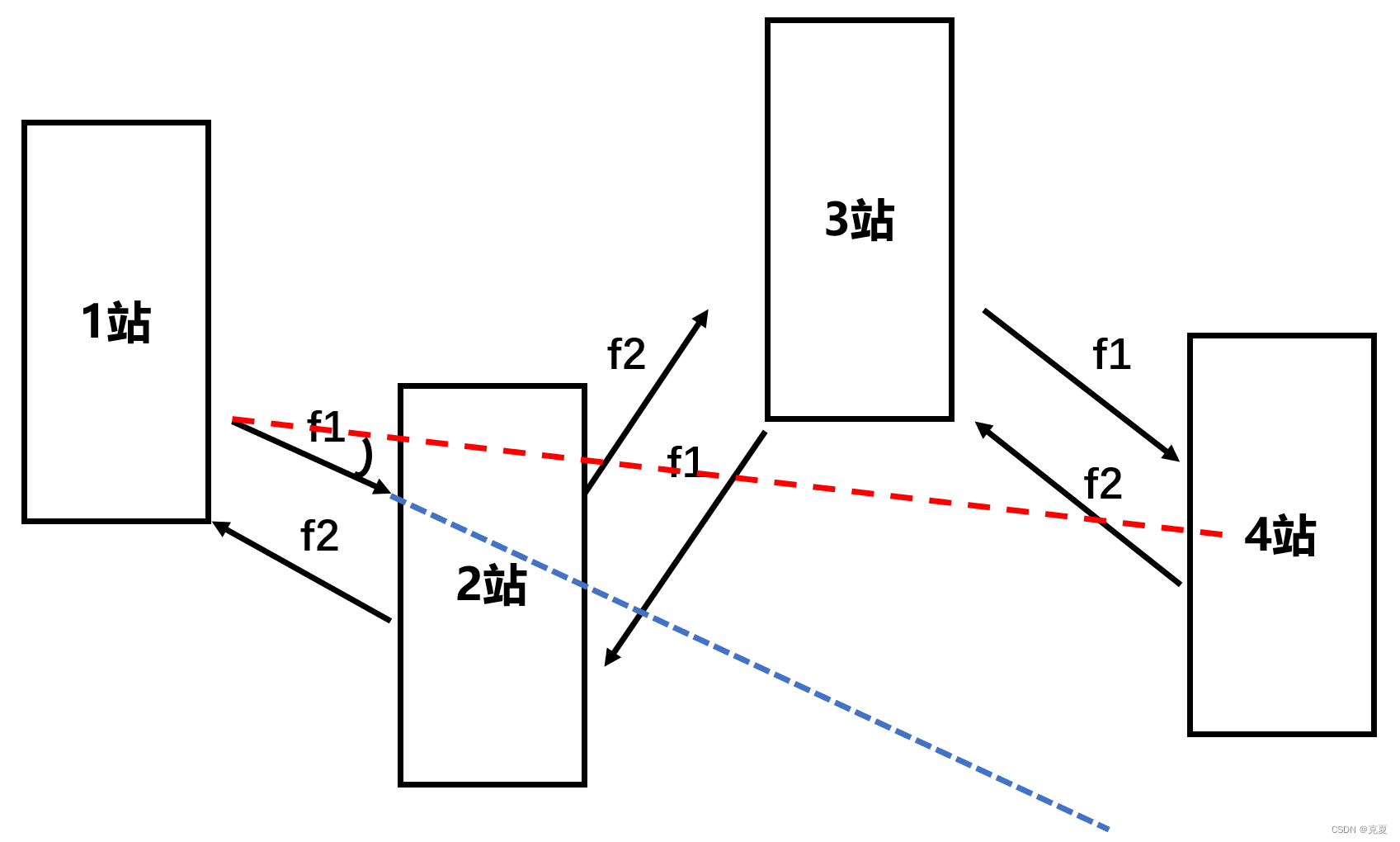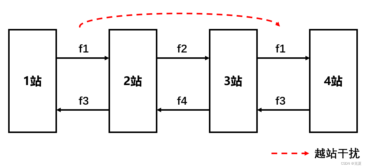 首先,以2站为例,反向干扰是因为当1站以f1频率发送信息时,3站这时候也可能以f1频率回传信息。这个时候,2站就可能会混淆了,因此出现反向干扰。而对于越站干扰,归根结底还是同频干扰的缘故。