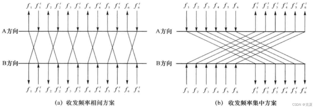 图5 多波道频率配置方案 (a) 收发频率相间方案 (b) 收发频率集中方案 [2]