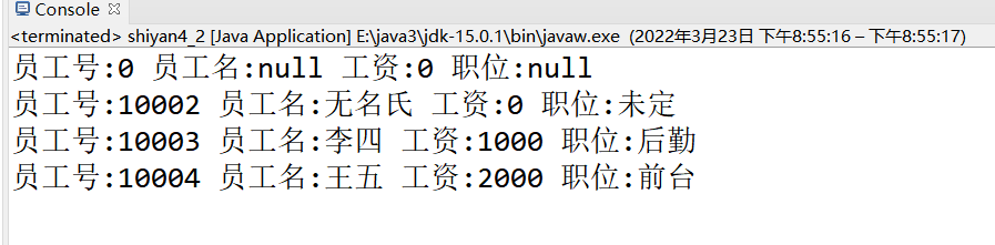 讯享网public class shiyan4_2 { public static void main(String[] args) { Staff s1=new Staff(); Staff s2=new Staff(10002); Staff s3=new Staff(10003,"李四"); Staff s4=new Staff(10004,"王五",2000,"前台"); s1.print(); s2.print(); s3.print(); s4.print(); } }